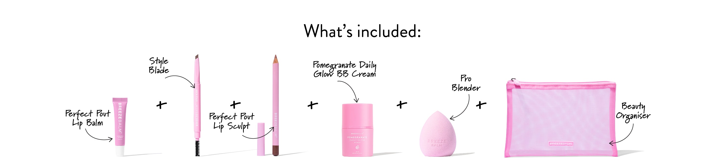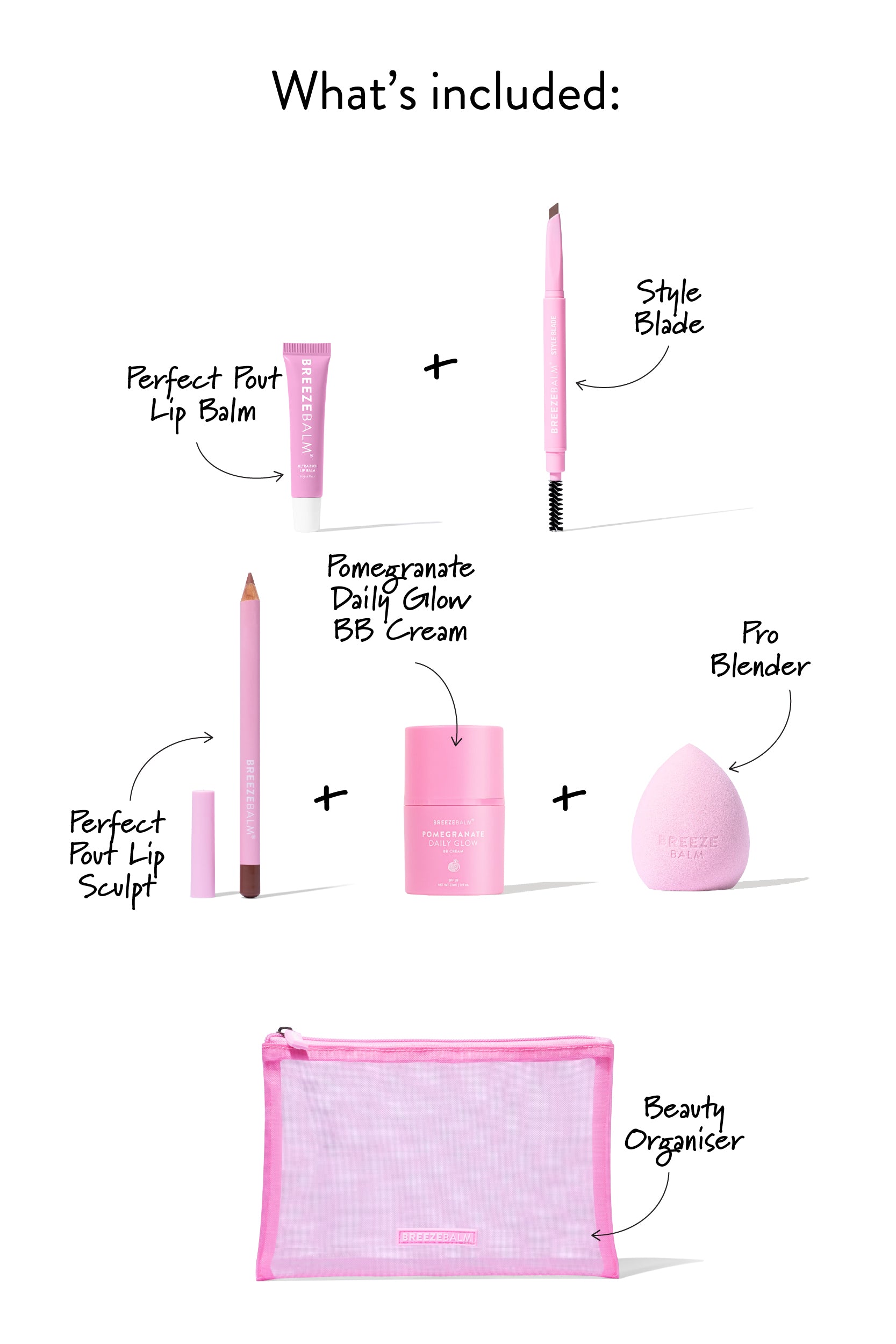 SAVE $60+ WITH THIS SET! ★ x1 Pomegranate Daily Glow BB Cream★ x1 Style Blade Brow Pencil★ x1 Perfect Pout Lip Sculpt Lip Liner★ x1 Perfect Pout Lip Balm★ x1 Soft Pink beauty organiser