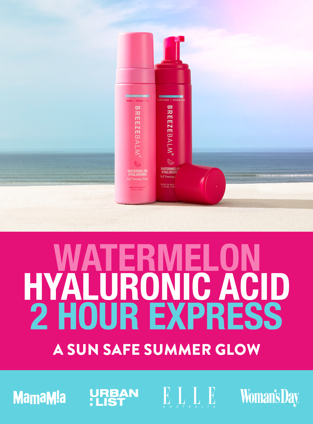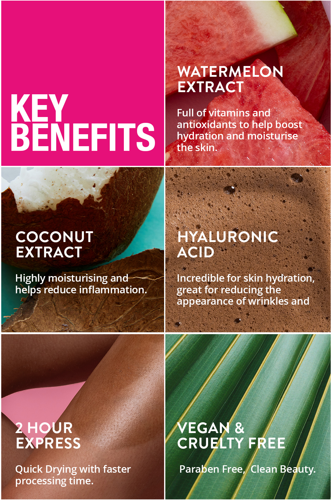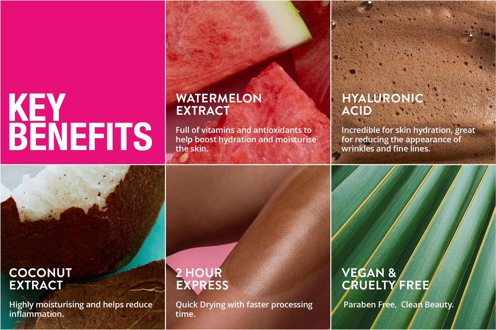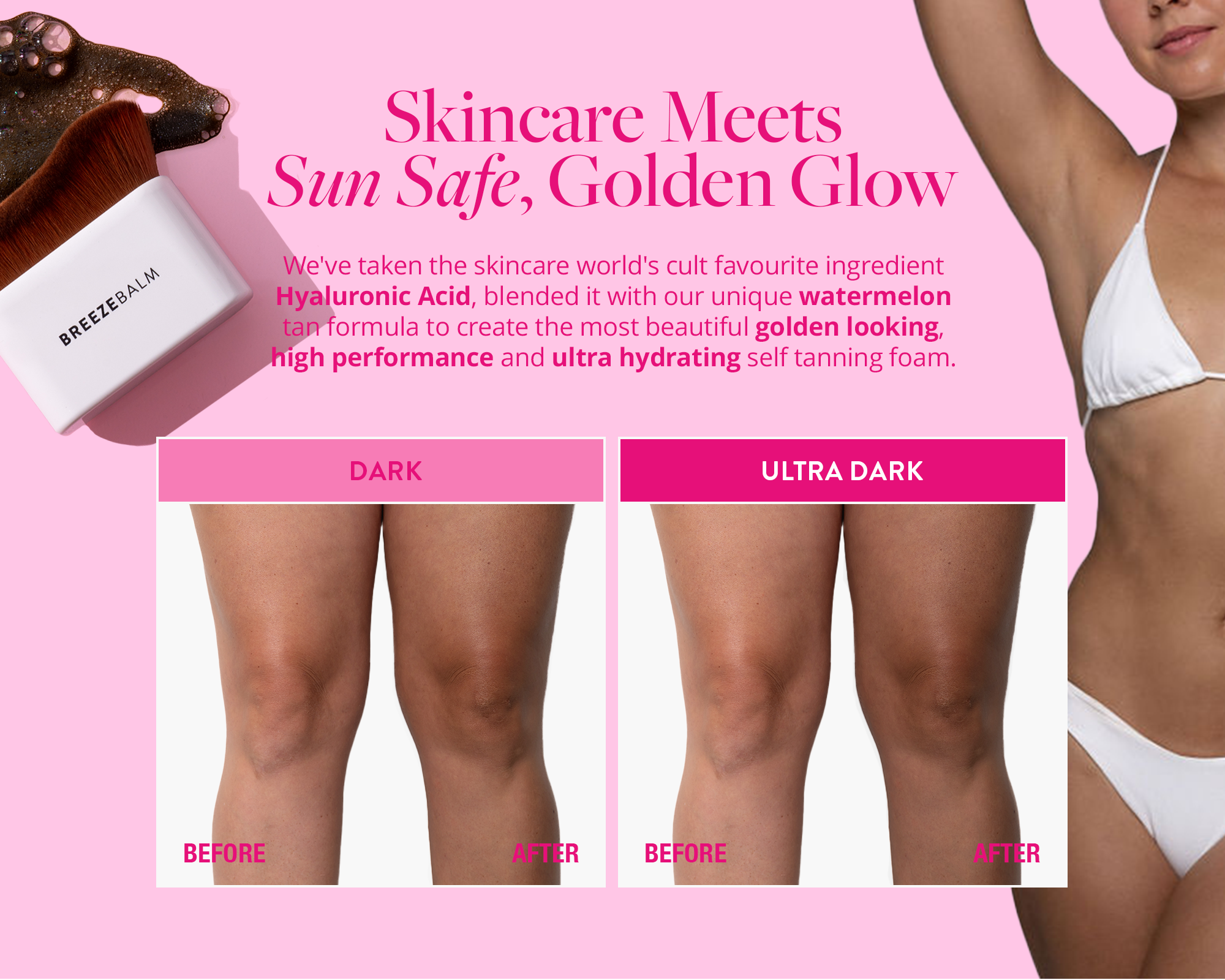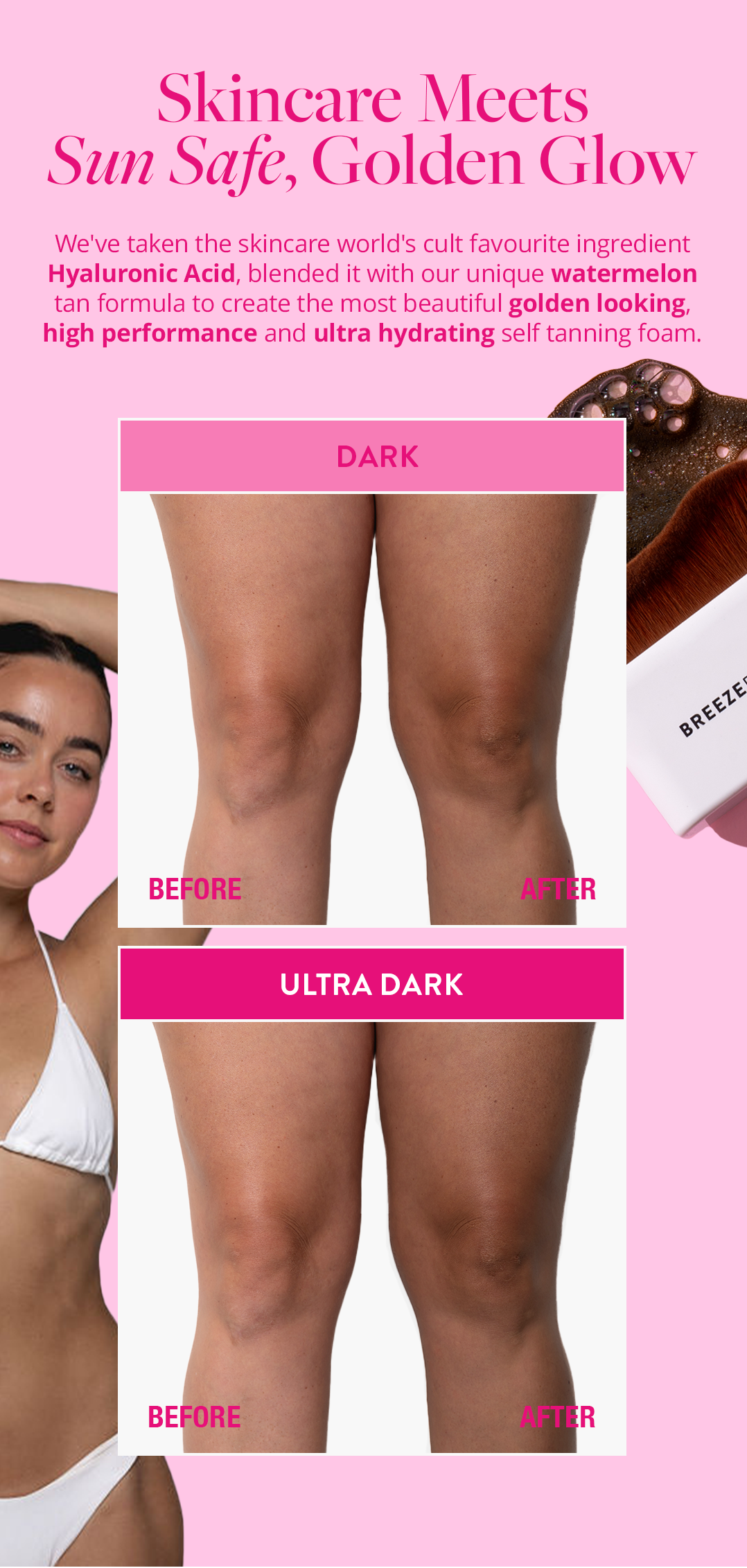 A TAN LIKE NO OTHER! We've taking the skincare worlds cult favourite ingredient Hyaluronic Acid, blended it with our unique tan formula and favourite fruit watermelon to create the most beautiful golden high performance, hydrating self tanning foam.